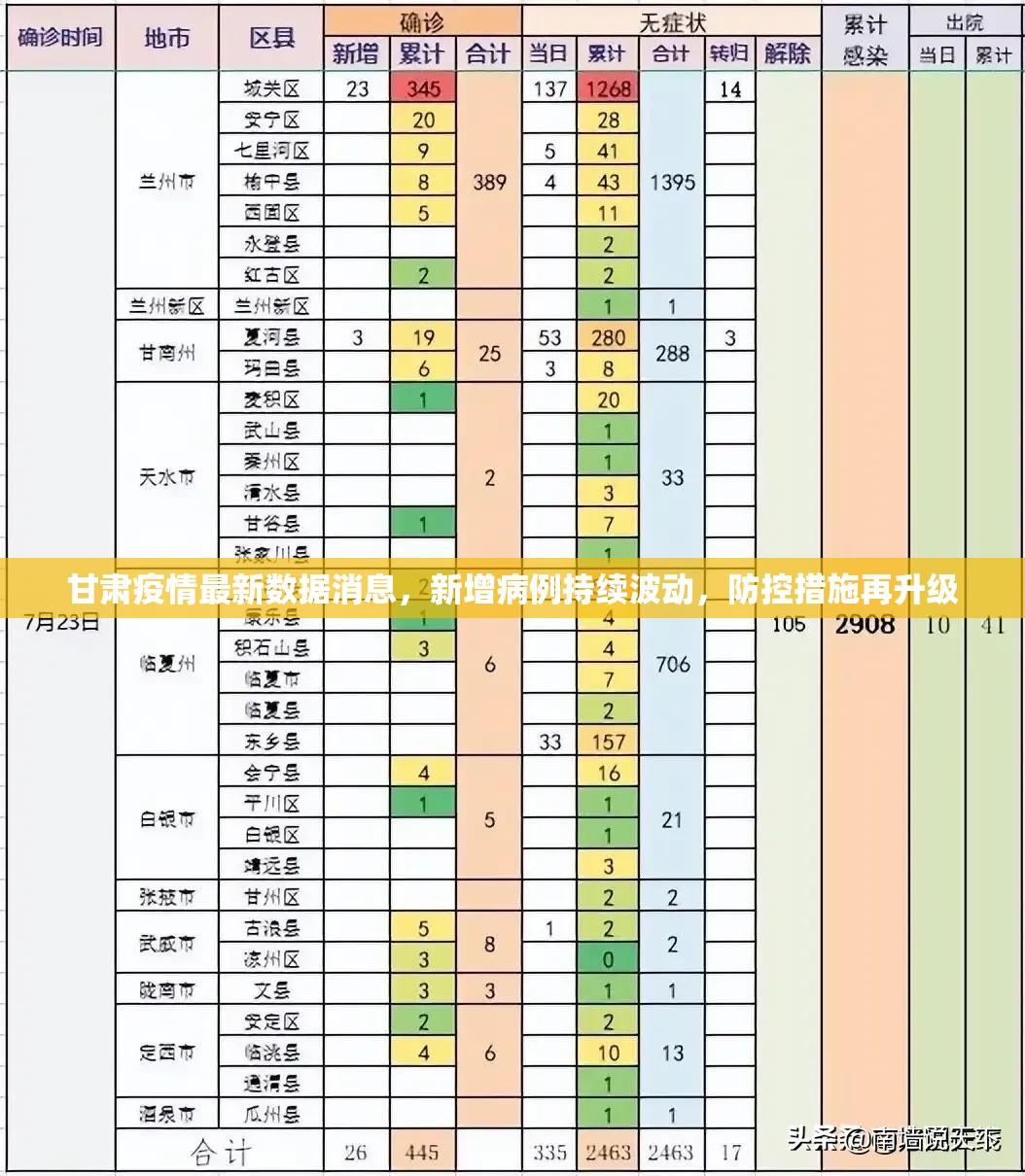 甘肃省的疫情数据再次引发社会关注,根据甘肃省卫生健康委员会发布的最新通报,截至2023年10月,甘肃省新增本土确诊病例和无症状感染者呈现波动上升趋势,部分地区如兰州、天水等城市成为疫情重点区域,这一数...