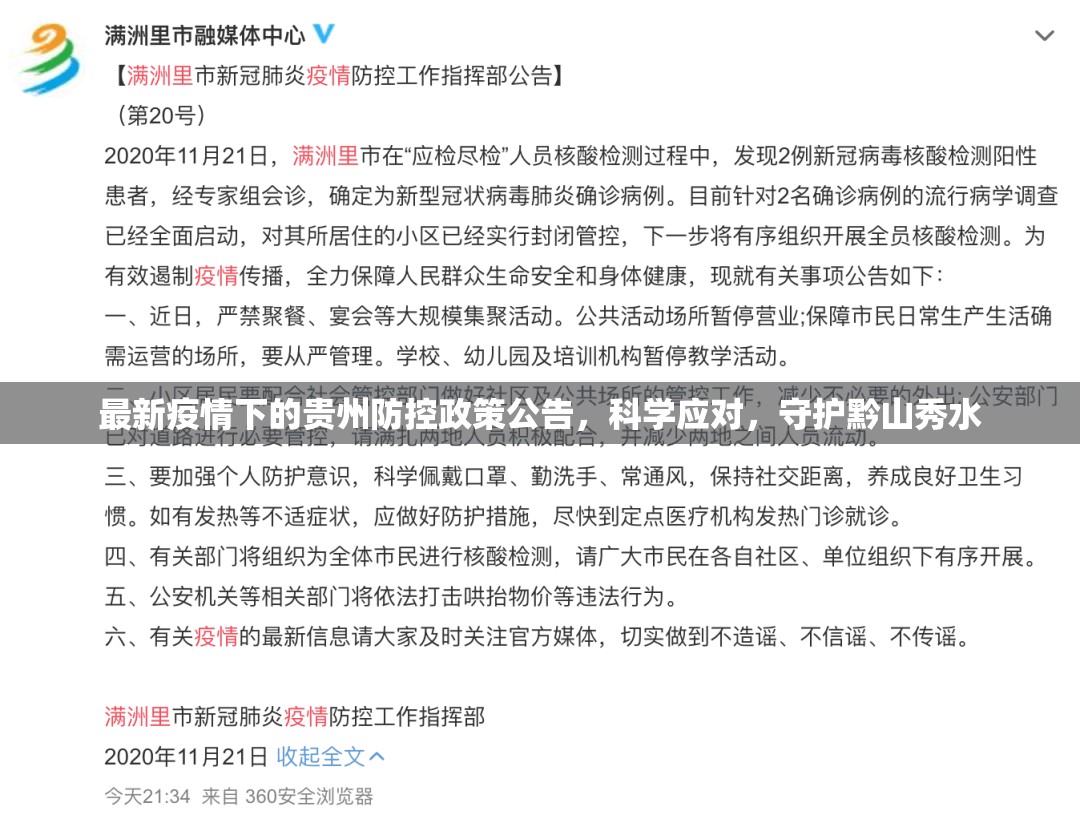 随着全球疫情形势的不断变化,中国多地也出现了局部疫情反弹,贵州省作为西南地区的重要省份,始终坚持以人民为中心的发展理念,及时发布最新防控政策公告,以科学精准的措施应对疫情挑战,本文将结合最新疫情数据和...