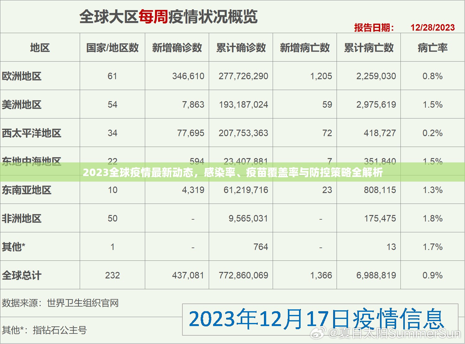 全球疫情最新数据全景扫描(2023年Q3)根据WHO最新周报(2023.8.28-9.3),全球累计确诊病例突破9.8亿例,较上月增长12.7%,值得注意的是,全球平均感染率呈现"两极分化"特征:...