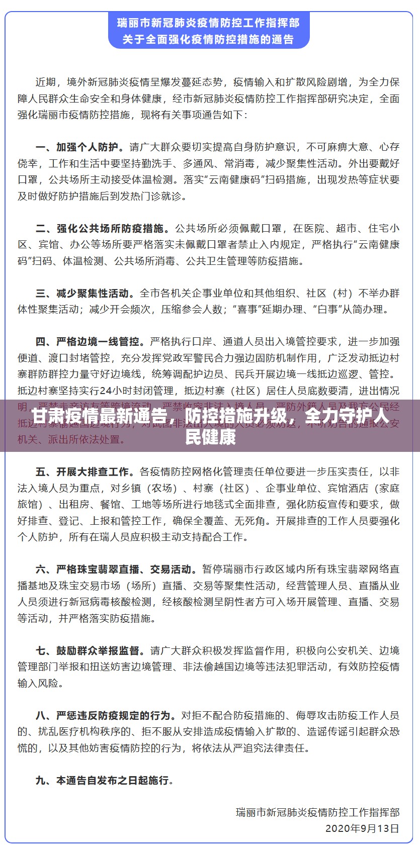 甘肃省卫生健康委员会发布了最新的疫情通告,针对当前省内疫情形势,出台了一系列强化防控措施,这一通告不仅反映了甘肃在应对疫情反弹中的积极态度,更凸显了地方政府在公共卫生危机中的责任与担当,本文将结合最新...