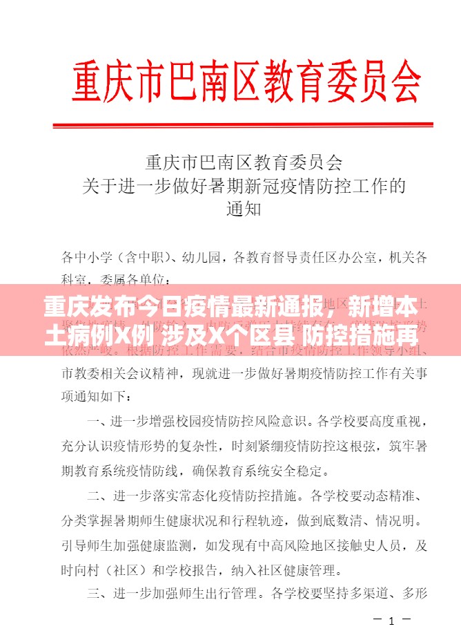 【重庆疫情动态速递】(2023年X月X日更新)核心数据通报根据重庆市卫生健康委员会今日X时发布的第X轮疫情通报,全市新增本土确诊病例X例(其中X例为集中隔离发现、X例为主动筛查发现),新增...