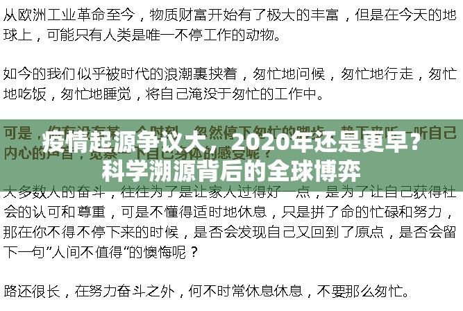 疫情起源的"时间迷雾"与科学溯源(2019.12-2020.1)2020年1月3日,中国疾控中心病毒所首次在不明来源的华南海鲜市场样本中检测到新型冠状病毒(SARS-CoV-2),但全球溯源工作却...