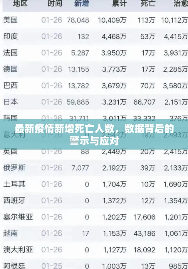 随着全球疫情的持续演变,最新疫情新增死亡人数再次成为公众关注的焦点,这些数据不仅仅是冰冷的数字,更是对公共卫生体系、社会应对能力以及个人防护意识的严峻考验,本文将从最新数据出发,分析新增死亡人数的趋势...